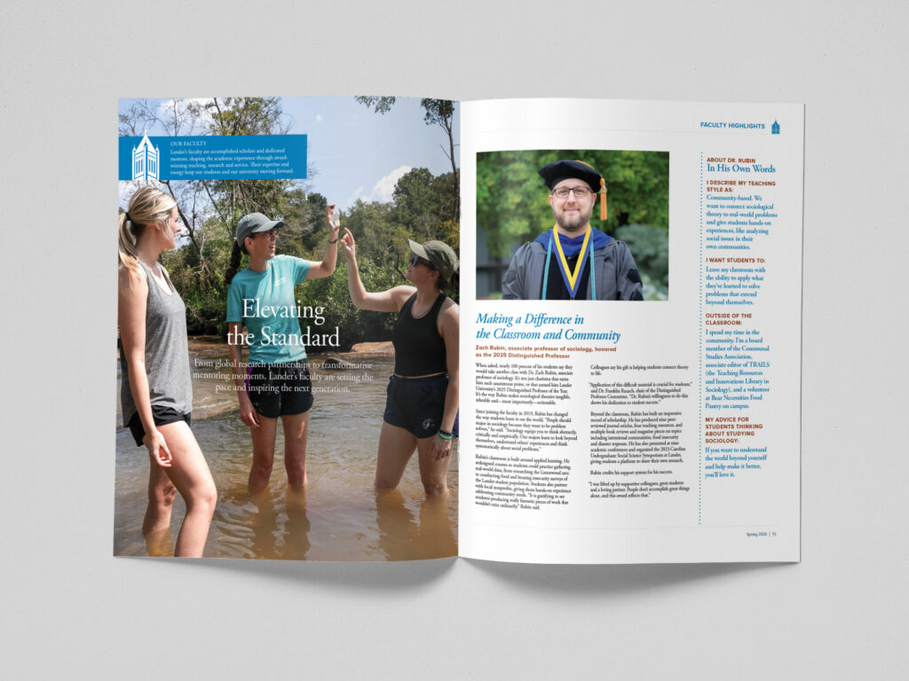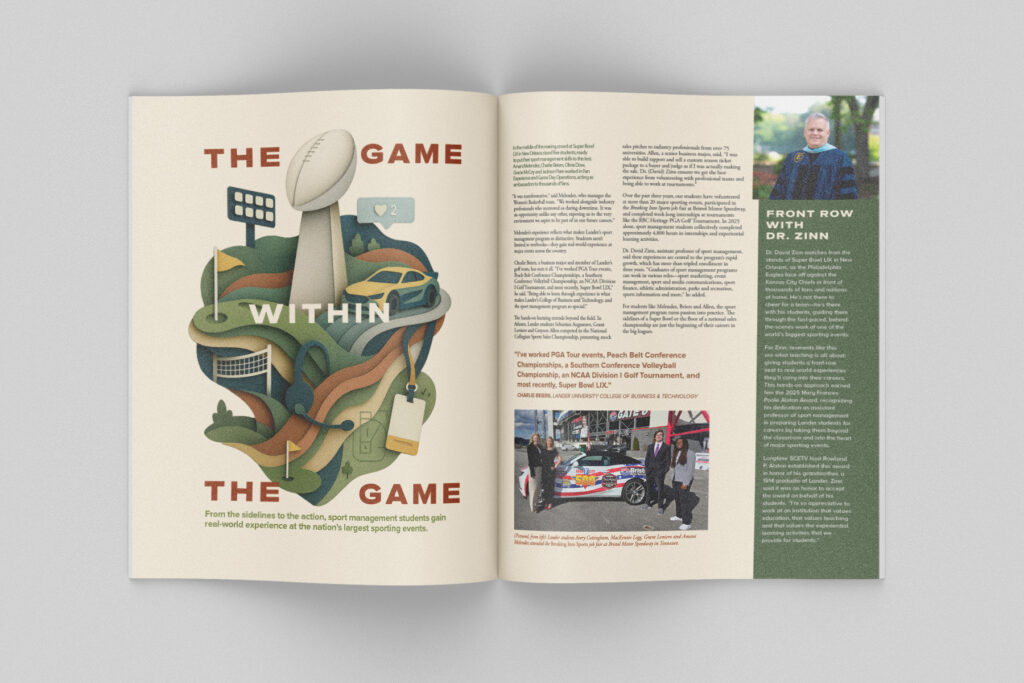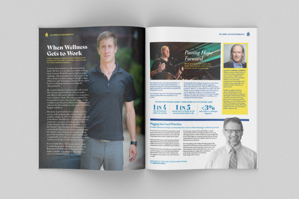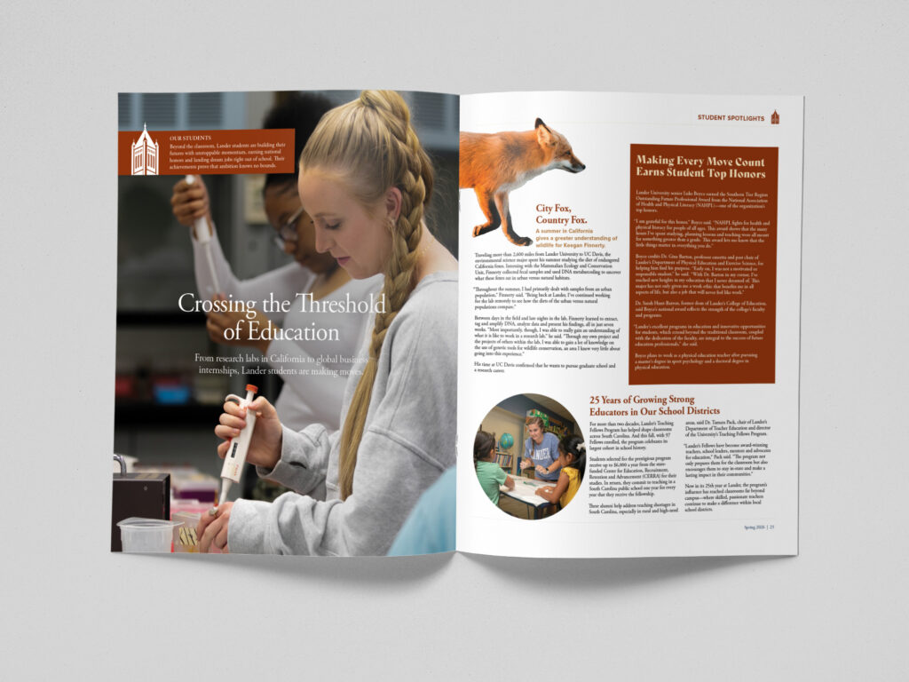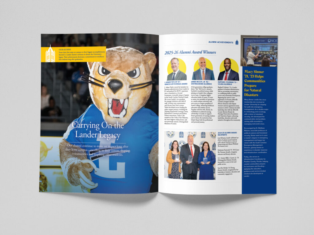 Lander University’s end-of-year magazine historically connects alumni, students, and faculty through a shared snapshot of the year at Lander. For this issue, we worked in tandem with Lander’s most important stories from throughout the year. We took timely news—campus growth, academic investment, student achievement—and translated it into editorial-style narratives that felt human and story-driven.